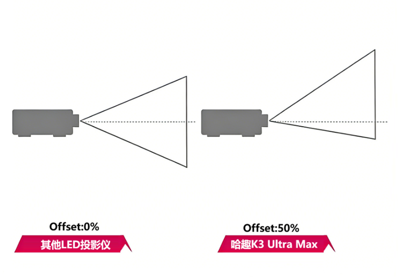 哈趣K3 Ultra Max采用的新一代EngineX Ultra Max全密封闭光机,支持50%offset光学偏轴,投射画面能向上无损偏移,避免被桌面上的物体遮挡画面的同时,还能保持画面比例和边缘清晰度不会有任何损失,与正投完全一致。