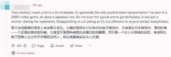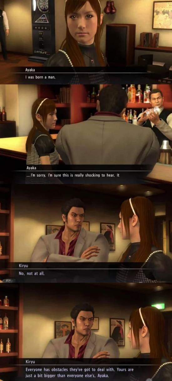被删除的支线之一名为“和我说话”,讲述了一位名叫绫香(Ayaka)的按摩师向桐生一马坦白自己是跨性别者的故事。在这段剧情中,桐生温和地安慰了绫香的自卑与不安,这段充满善意的对话也让不少玩家将桐生视为“跨性别友好”的角色。