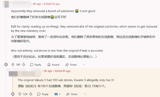 据了解,原版的《如龙3》一共拥有多达119个支线任务,而《如龙:极3》则是只剩下了31个(这一数字来自IGN的完整评测),等于将原作将近四分之三的支线内容直接砍掉,而其中不乏深受玩家喜爱的经典剧情。