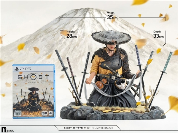 该手办按照《羊蹄山之魂》PS5实体版封面制作,手办高28cm、宽35cm、深33cm,采用PU、ABS以及高品质树脂材料制作。