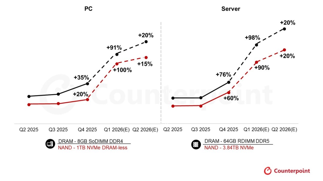 这一轮涨势始于2025年第四季度,当时PC内存与NAND价格已分别出现约35%和20%的上涨,服务器市场的涨幅更是高达76%和60%。进入2026年后,受人工智能等需求拉动,供需失衡加剧,导致价格加速攀升。