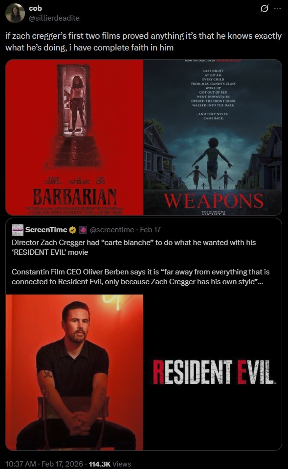 另外,游戏改编电影《生化危机》由《凶器》(Weapons)导演扎克·克雷格全权负责,康斯坦汀影业首席执行官接受采访时确认了这一点: