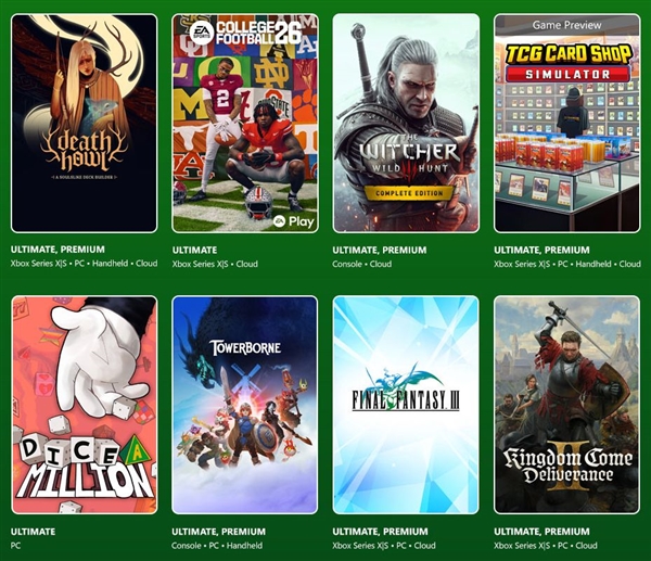 除了捷克人的天国拯救全系列,育碧的《阿凡达》以及黑曜石的《誓约》(Avowed )今日登陆XGP;Steam平台好评如潮的卡牌/战棋混杂游戏《死亡呼啸》,以及波兰人的《狩魔猎人3》定于明日与XGPU、XGP用户见面;《最终幻想3》定于3月3号与XGPU、XGP、PC Game Pass用户见面。
