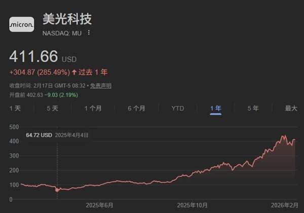 内存短缺导致美光的股价较去年最低点上涨600%,股价在本月初直逼440美元: