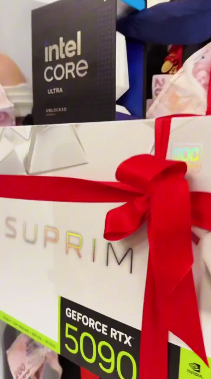 从视频来看,这份"硬核贺礼"包含一张微星RTX 5090级别的显卡,以及两条带散热马甲的大容量DDR5内存。视频最后,又一名好基友现身,送上英特尔Ultra系列CPU。保守估计,整套配件价格可能达到数千美元,而且高端显卡长期供货紧张,更显得诚意满满。