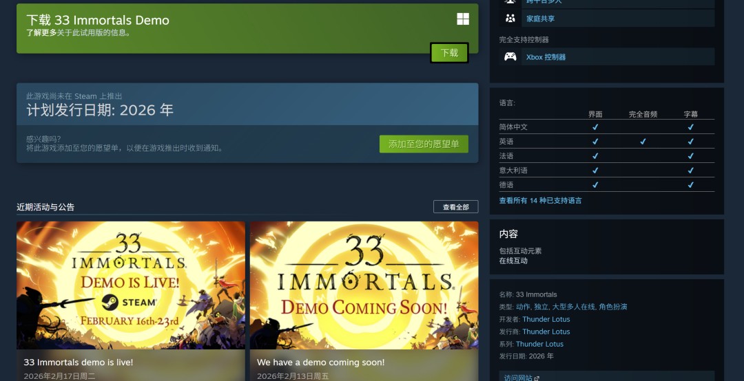 当前提供的是限时试玩版,约可体验1小时的游戏内容。33不朽灵魂仍处于积极开发阶段,因此可能会在正式上线前对内容进行调整。