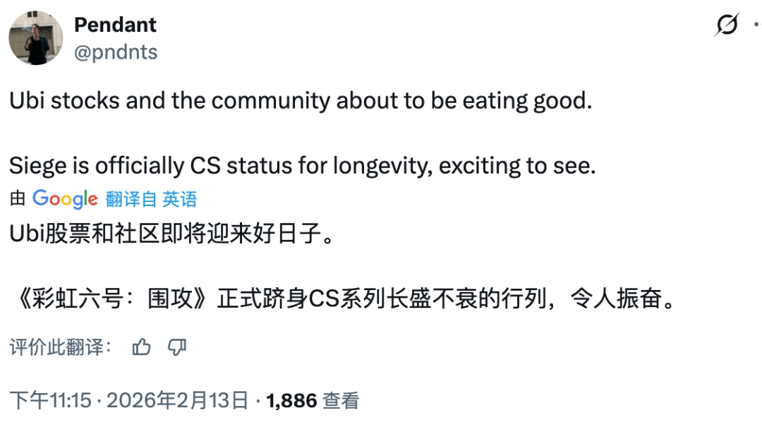 另外,也有观点认为,CN赛区的成立,有望让彩虹六号的商业生态如同FPS领域标杆CS系列般长盛不衰,同时推动并育碧股票的商业价值上涨,以及彩六玩家社区的发展向好。