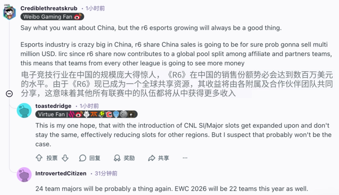 还是那篇Reddit,有人很快地算了一笔账,认为彩虹六号:攻势在中国市场的规模会达到数百万美元的水平,中国电竞市场的庞大体量是显而易见的,CN赛区的加入意味着整个联盟生态都将受益于这片市场的流量与商业增量。更重要的是,R6 SHARE的全球共享分红机制,意味着CN市场带来的收益将惠及所有联盟成员。
