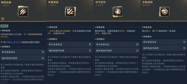 1号插件"弹雨协奏",2秒内命中敌人20次后下一次换弹速度加快,能够保证在爆发时子弹装填速度。