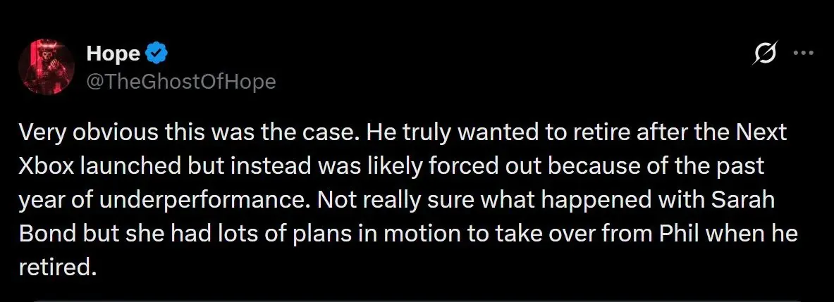社交媒体上,知名舅舅"Ghost of Hope"爆料,斯宾塞原本计划在下一代Xbox发布后卸任CEO一职。但由于去年游戏部门业绩不佳,他现在被迫提前离职。