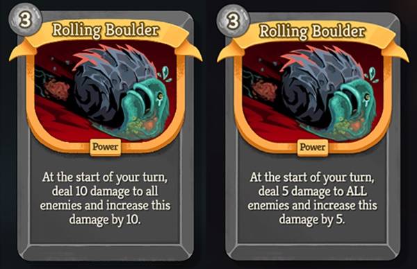 滚石:3费。你的回合开始时,对所有敌人造成10点伤害,然后将该伤害增加10点。