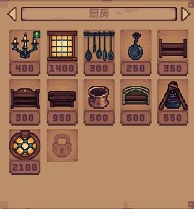 厨房的必需品是食材,解锁厨房之后玩家购买食材这里就会自动制作食物赚钱了,要记住及时补充食材,这里可以放置铁锅和操作台等家具。