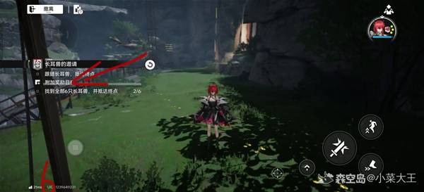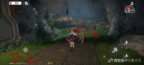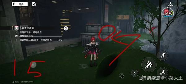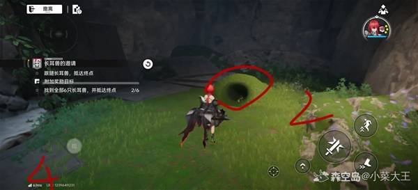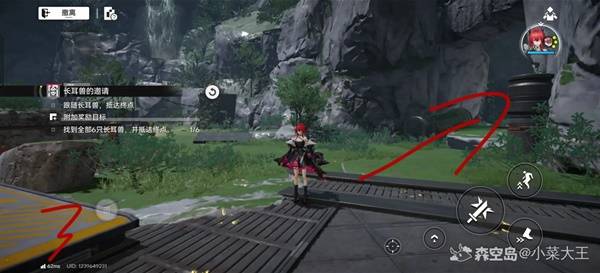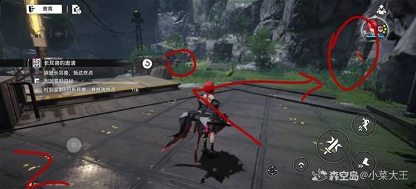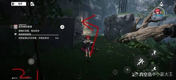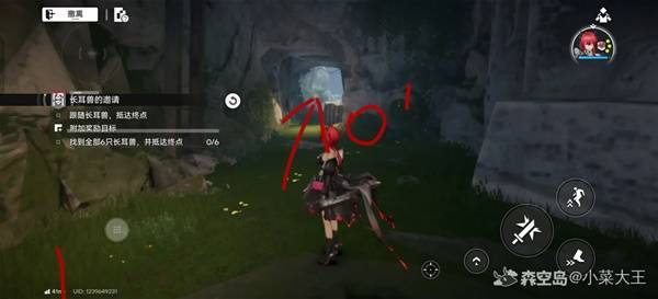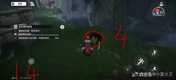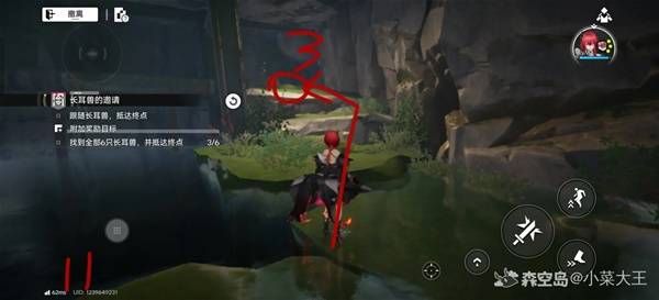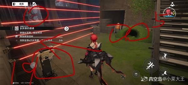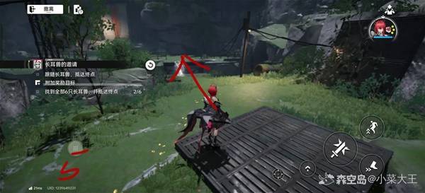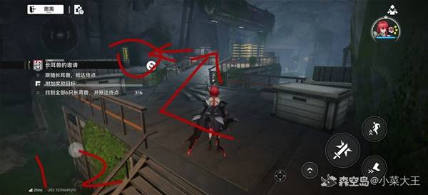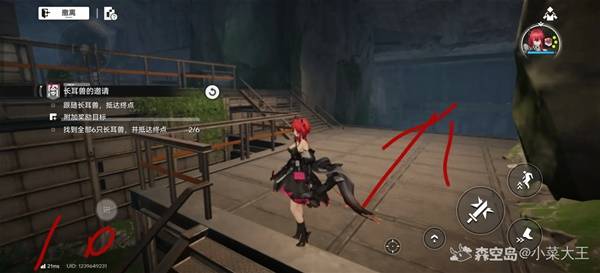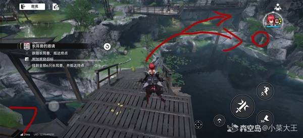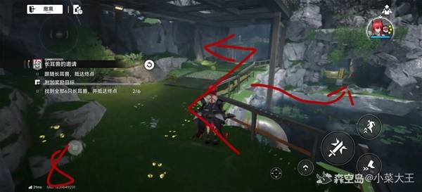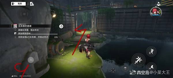 3.跟着路线走,在下坡的右边有一个开关,过去打掉再回来,继续跟着路线走可以找到第三只兔子