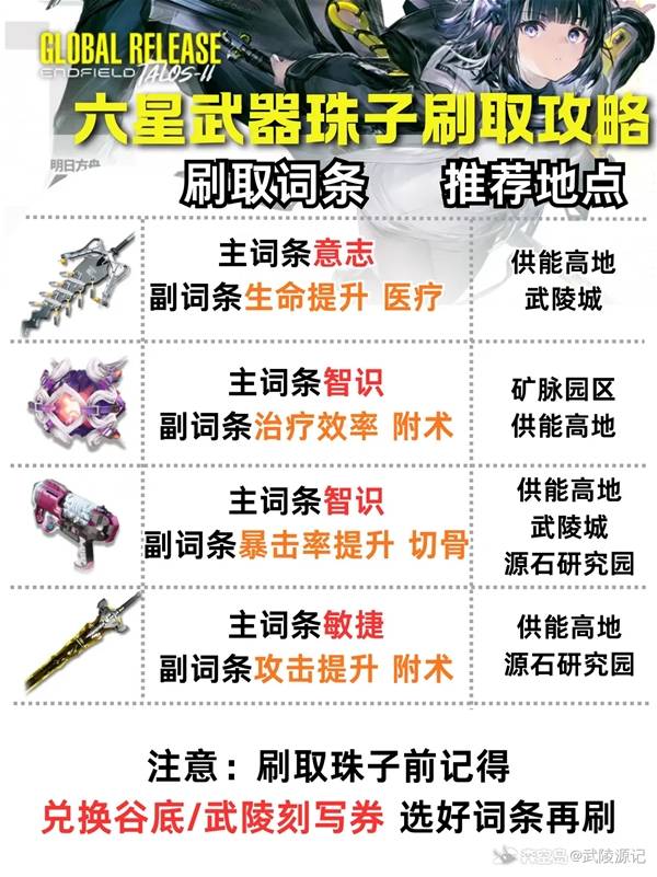 明日方舟终末地中有很多的六星专武,那么这些武器要怎么刷珠子呢?下面请看由"武陵源记"带来的明日方舟终末地六星专武珠子刷取一图流,一起来看看吧。