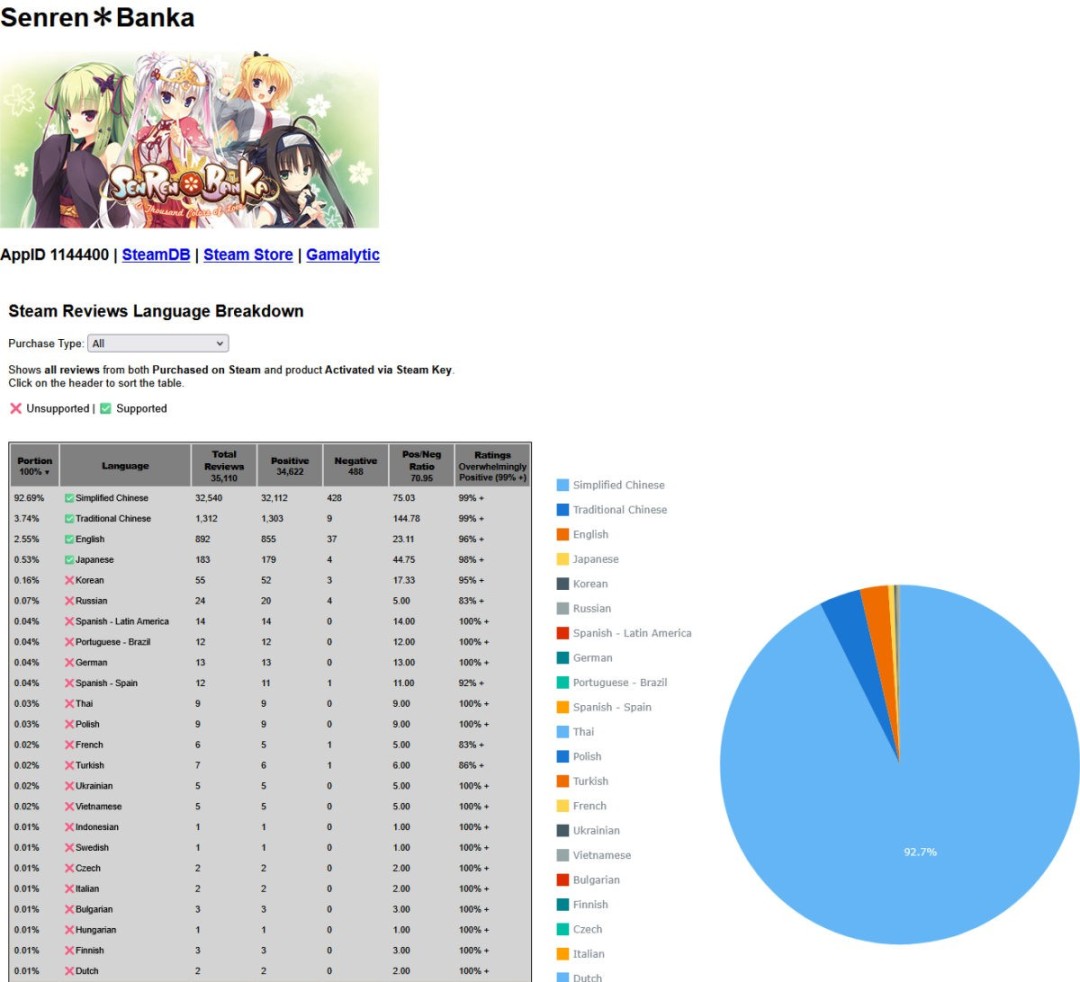 根据Steam数据分析工具Steam Scout的数据,从语言评测占比来看,简体中文用户占据了绝大多数,其次是繁体中文用户,而日语用户反而占比最低。由此可见,本作的成功与国内玩家的流传甚广的梗文化密不可分。