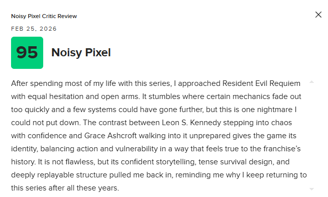 作为一个与生化危机系列相伴了大半生的玩家,我是怀着既犹豫又敞开怀抱的心情迎来安魂曲的。它的确有些踉跄--某些机制消失得太快,部分系统本可以挖掘得更深--但这仍是一场让我欲罢不能的噩梦。里昂·S·肯尼迪自信地踏入混乱,与格蕾丝·阿什克罗夫特毫无准备地步入险境形成了鲜明对比,这种反差赋予了游戏独特的个性,在以符合系列历史脉络的方式下,巧妙地平衡了动作性与脆弱感。它并非完美无瑕,但那股自信的叙事张力、紧绷的生存设计,以及极富重玩价值的架构,再次将我拽回了那个世界,让我忆起这些年来为何始终对这部系列难以割舍。