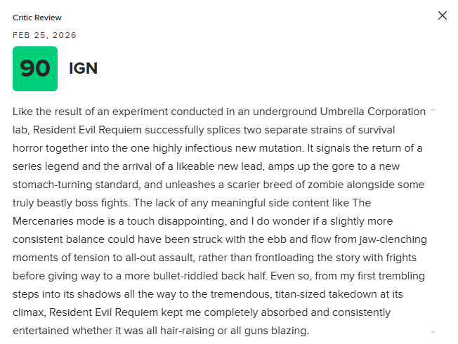 生化危机9:安魂曲将于2月27日正式发售,登陆PC、PS5、Xbox Series以及Switch 2平台。本作媒体评分现已解禁。截至目前,生化危机9:安魂曲M站均分88分,共收录110家媒体。