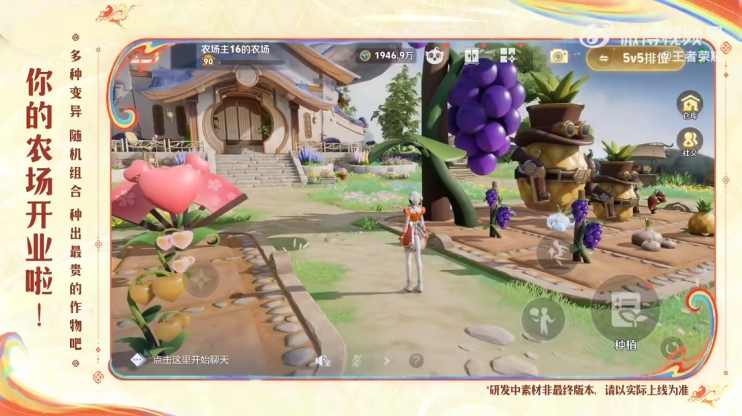 在直播中,王者荣耀的农场玩法首次曝光,玩家可以在王者"干农活",支持播种、浇水、收获、还可以去好友农场"串门"。农场玩法提供数十种作物种植,支持自由转动视角等操作,预计还拥有升级田地、作物变异等玩法。同时,部分作物还拥有英雄的特征,例如酷似马可波罗的"马可菠萝"、小乔的扇子等。