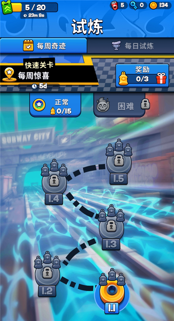 这个模式下,所有跑酷过程中的障碍全部固定,不再随机,说白了就是得背板。所以还是具有一定难度的,如果是初见,即便在普通难度下,想达成 3 星也得多试几次才行。而且只有 3 星,才能继续解锁后续挑战。