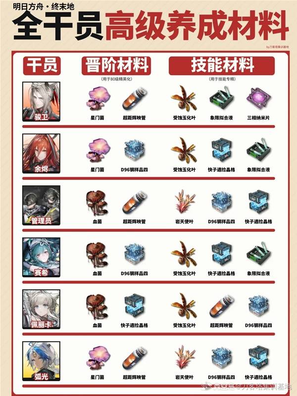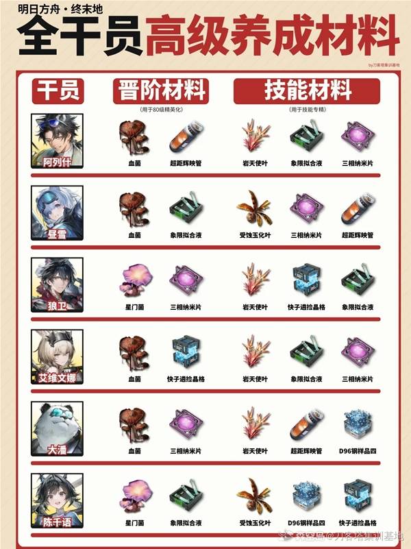 明日方舟终末地干员们在技能提升与高等级突破的情况下需要用到不少的金色品质素材,那么每个角色的需求分别是什么呢,下面请看"刀客塔集训基地"带来的明日方舟终末地全干员高级材料需求表,希望能够帮助大家。