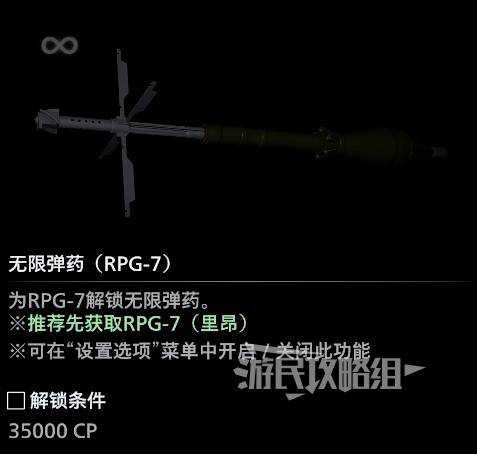 【无限弹药(RPG-7)】需要先购买解锁【RPG-7】,然后从补给箱中取出RPG-7才能在设置界面启用并生效。