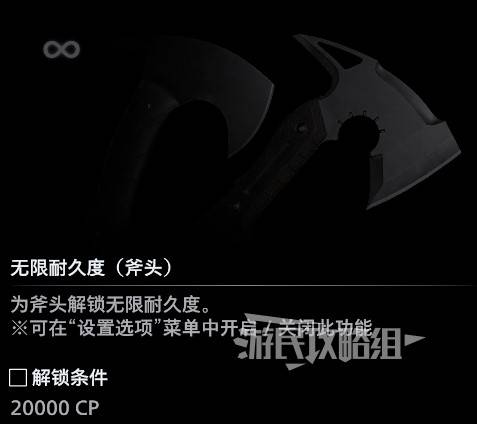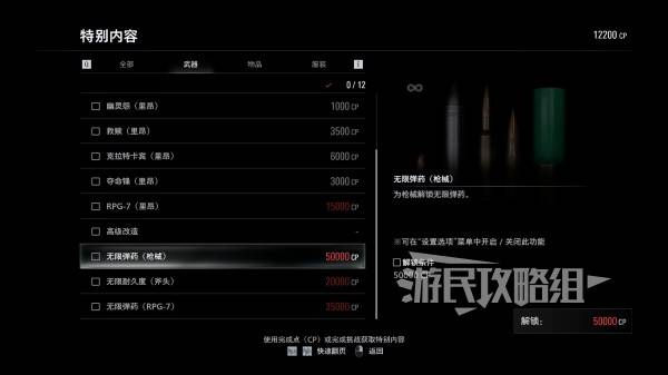 无限武器解锁优先级本作的无限武器包含【无限耐久-小刀】、【无限弹药-枪械】、【无限弹药-RPG】、【无限耐久-斧头】。枪械类武器的无限弹药需要消耗5万CP点数解锁,成本相当高昂,建议通过完成挑战来快速积累CP点。