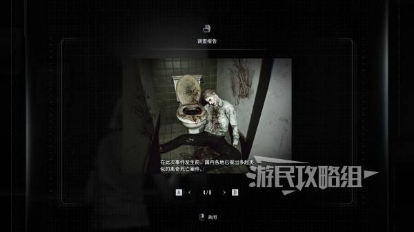※目前尚未明确冲水8次的线索来源,比较合理但很生硬的是马桶旁边隔间墙上用血迹写了模糊的数字"8"。可以在【文件-鹪木市-调查报告】中的第四页看到(初始在物品栏自动获得的文件)。