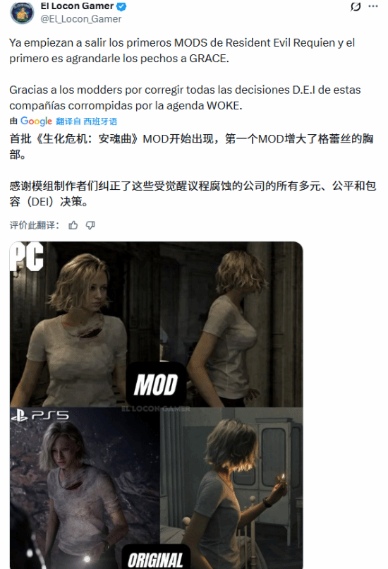 3 月 2 日,西班牙游戏博主 El Locon Gamer 在 X 平台发文,《生化危机:安魂曲》的首个玩家自制 MOD 已发布,该 MOD 名为 “Bigger Boobs for Grace”,由作者 Keff0 制作,功能为增大女主角格蕾丝的胸部尺寸,并标注为 “成人”分类。