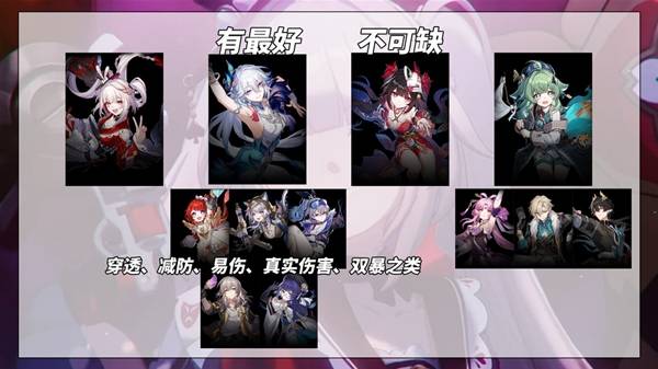 想要爽玩,火花+爻光+花火的固定搭配很难省去。但考虑到部分玩家可能仅有1金预算,却又非常喜欢火花。在没有爻光的情况下,替选辅助优先寻找穿透、减防、易伤、真实伤害、双暴之类的有效乘区,如/缇宝/赛飞儿/银狼/记忆主/佩拉,先过渡,等待后续欢愉主或其他欢愉角色。