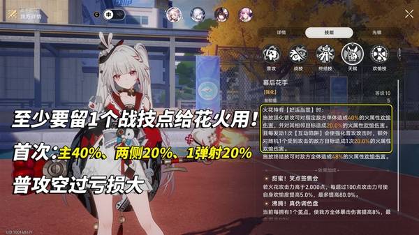 花火消耗首个战技点,可造成主目标40%、2侧扩散20%、随机弹射1次20%的欢愉伤害,而后续继续增加战技点消耗仅仅是每点提高20%欢愉弹射倍率。因此需规划好,确保火花行动前,至少留1个战技点给她用~