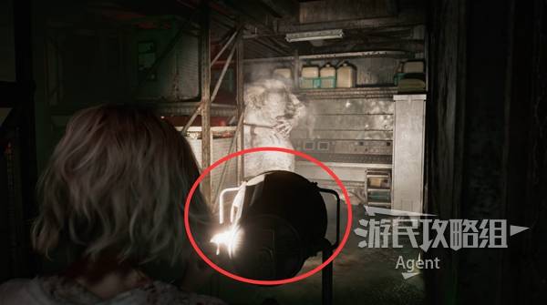 顶棚开合装置旁有个探照灯,先用探照灯暂时让怪物动不了,然后再去操作顶棚开合装置。