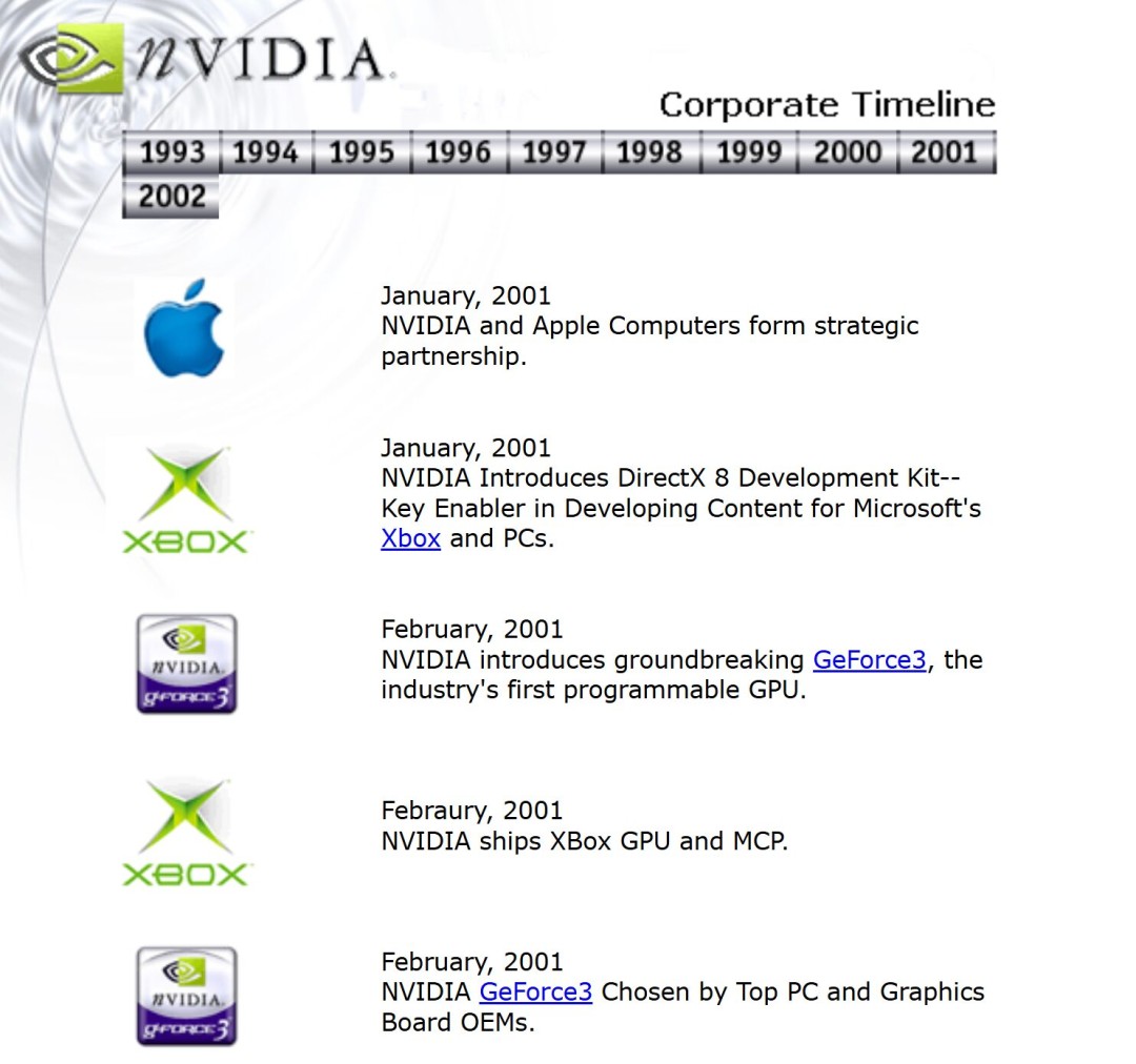 Geforce 3还是英伟达在当年更广泛战略的一部分。2001年,英伟达和Xbox、苹果达成了合作,英伟达为当时的Xbox出货了Xbox GPU和MCP。