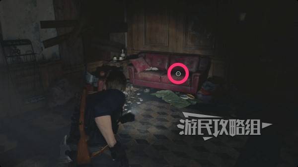 位于进入浣熊市东部不久后到达的苹果门酒店内,就在红色沙发上。