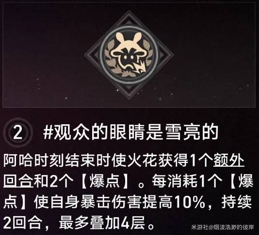 2魂:阿哈时刻结束火花获得额外回合和爆点。消耗爆点提高自身暴伤。