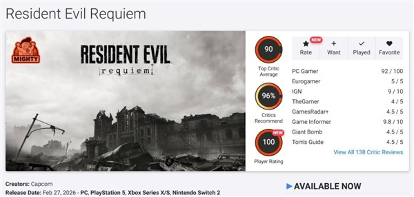 截至发稿时,《生化危机:安魂曲》在Metacritic上已收录约120家媒体评测,其中97%为正面评价,几乎无负面评分。