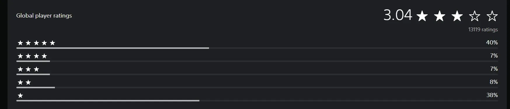 目前马拉松在全球PSN上共有超过13119条评价,尽管40%的用户给出5星好评,但也有差不多数量的用户给出1星最差评价,占比38%。