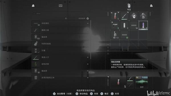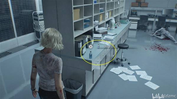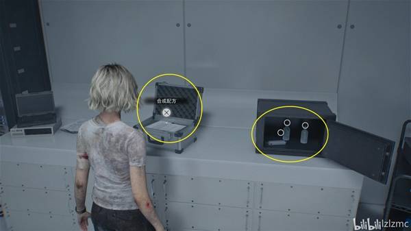 进入生物武器储备室05,物资如图所示,使用3个溶血注射器干掉3个舔食者,最后一只舔食者用硫酸瓶干掉,其他丧尸用手枪爆头打掉。如图进门左手边第一个研究箱,使用掌纹打开,里面能获得最后一个"腰包"。