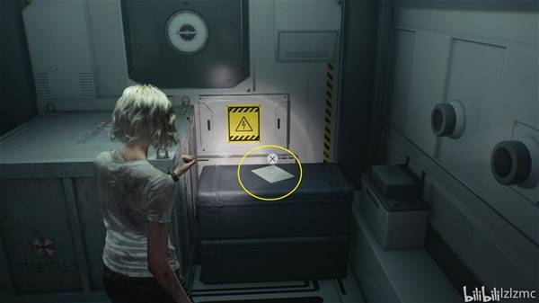 大厅向西南方走,来到侯见室,下楼梯来到生物武器储备室05门口,右转进入保护伞研究箱如图位置,箱子上获得【文件71:灭菌室保险箱】。