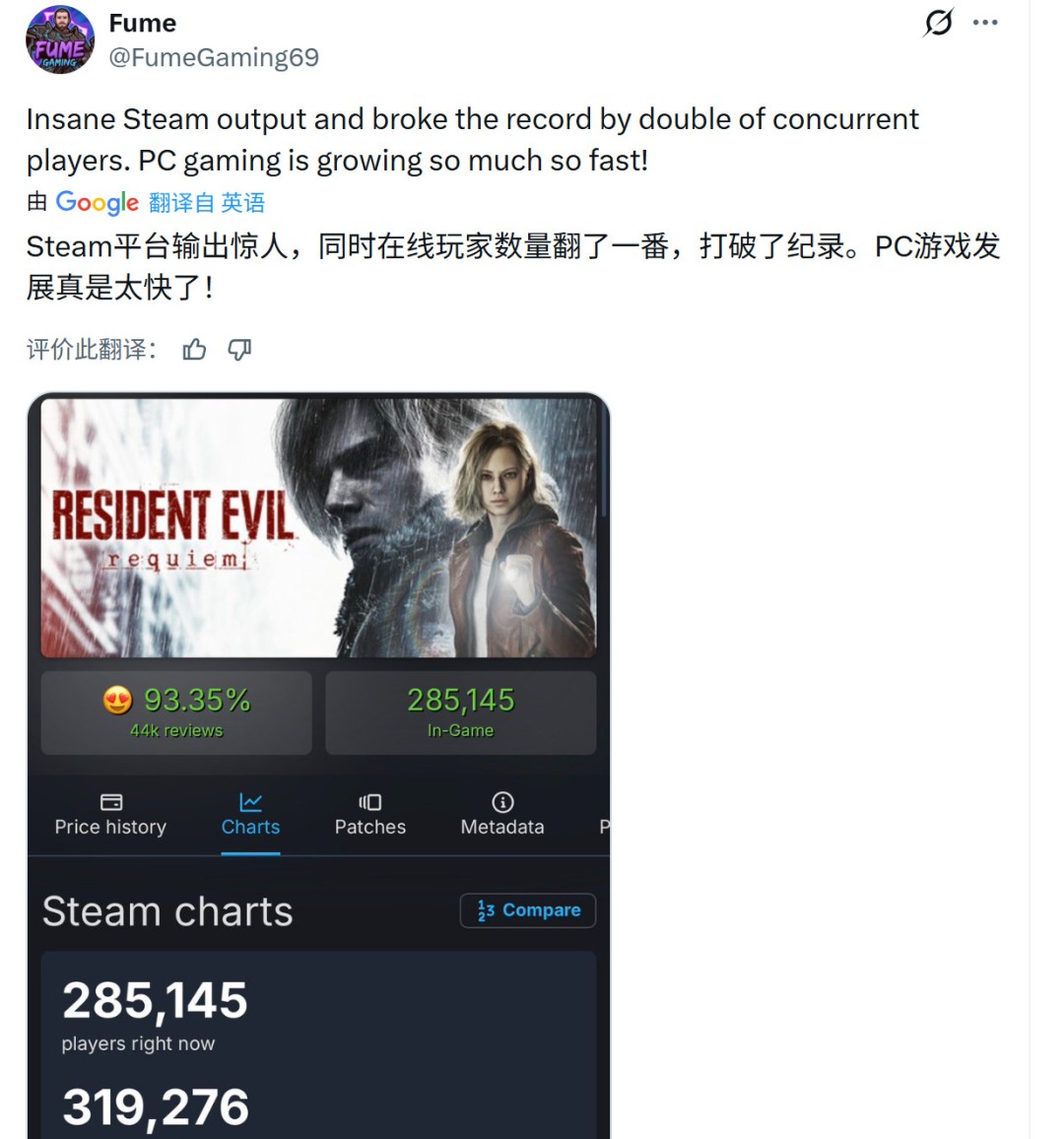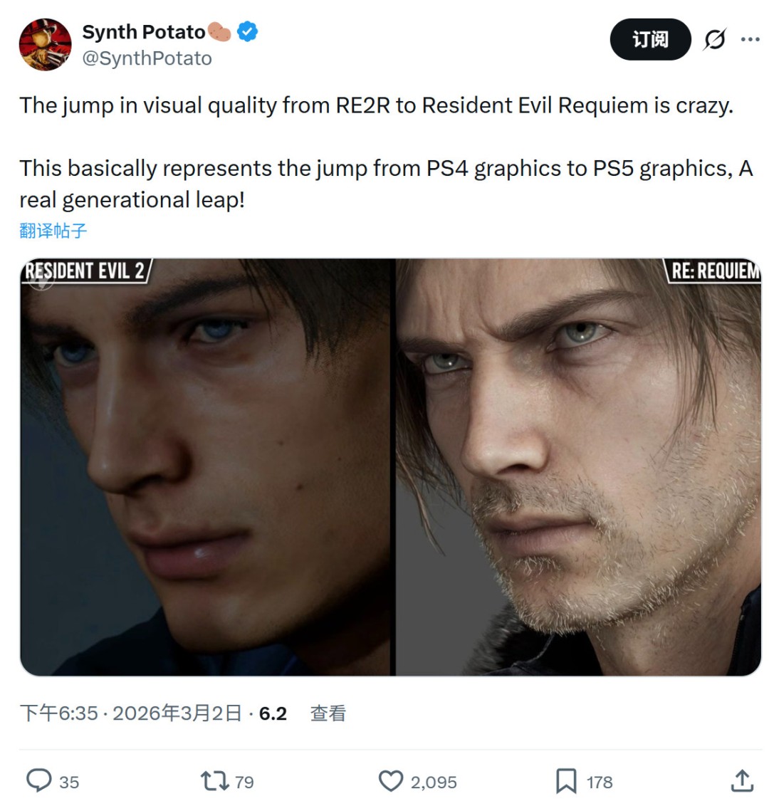 生化危机9现象还在继续,推主@SynthPotato称赞生化危机2:重制版到生化危机9的画质跃升简直太疯狂。这基本上代表着从PS4画质到PS5画质的一次飞跃,真正的代际跃迁。