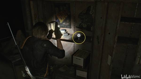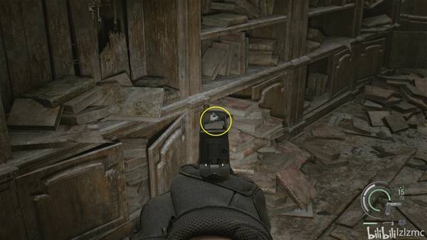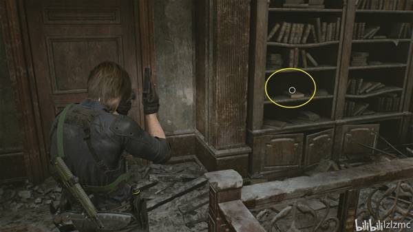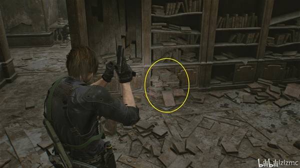 转过身,千斤顶同一位置,如图看到背后书架,从左数最下面第二格有书堆挡住,走到侧面就能看到玩偶,使用手枪打掉黑白浣熊先生22。