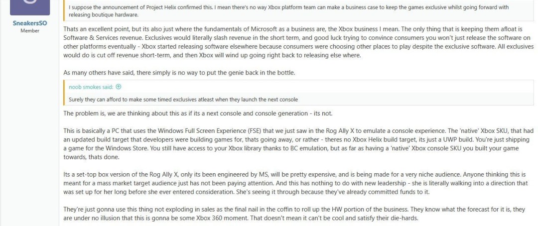 这位内部人士在NeoGAF论坛上写道:"这基本上是一台使用Windows全屏体验(FSE)的PC,就像我们在ROG Ally X上看到的那样,用来模拟主机体验。之前开发者用来开发游戏的'原生'Xbox SKU(拥有更新的构建目标)即将成为历史……现在没有Xbox Helix的构建目标了,只有UWP构建。你最终只能把游戏发布到Windows应用商店。虽然通过向下兼容的模拟,你仍然可以访问你的Xbox游戏库,但你之前用来开发游戏的'原生'Xbox主机SKU已经不复存在了。"