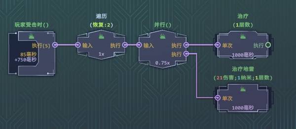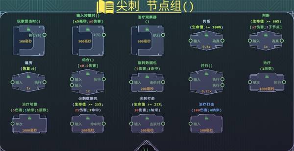 这个角色有两个输出技能,不过使用都会减少玩家的血量,另外它还有一个受击触发的根节点,所以具体玩法就是使用尖刺数据包和尖刺打击输出,输出的同时自己会掉血,然后触发受击节点来治疗自己。