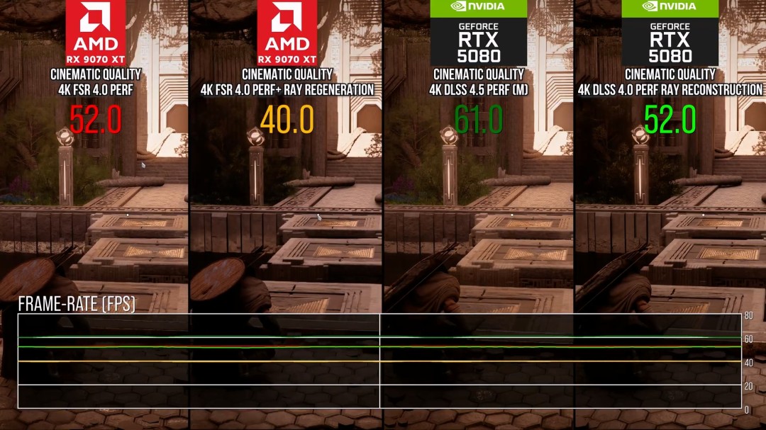 在RTX 5080上,4K性能模式开启Ray Reconstruction(光线重构)后,性能下降约14%