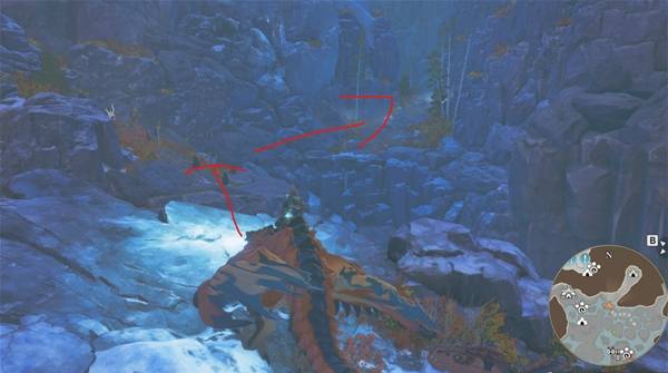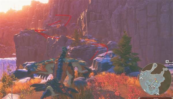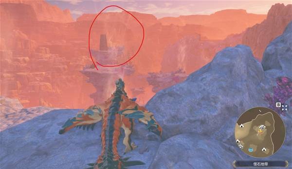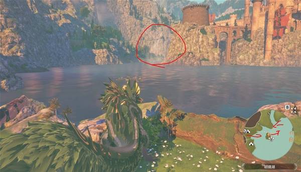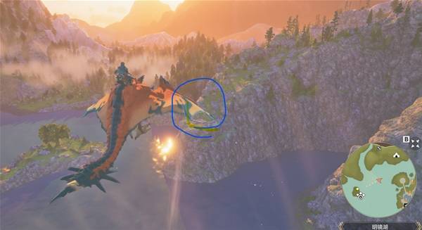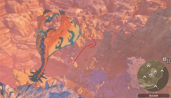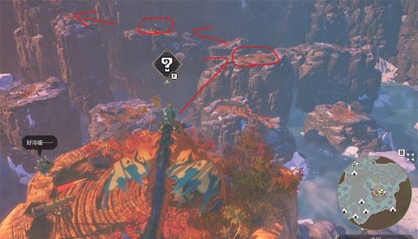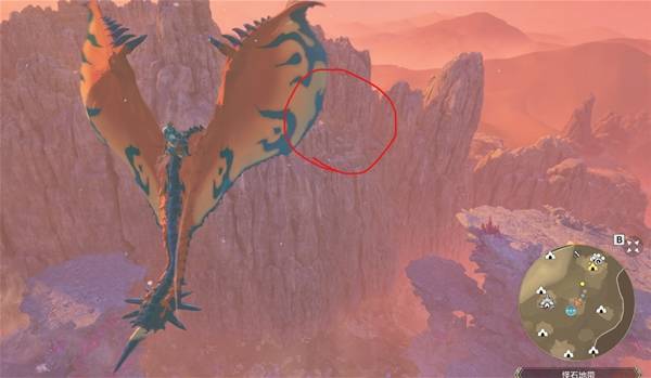 等到乘着气流到最高点后,朝着下图红圈处的山崖飞过去,到地方后,爬上峭壁后沿着路走就到了