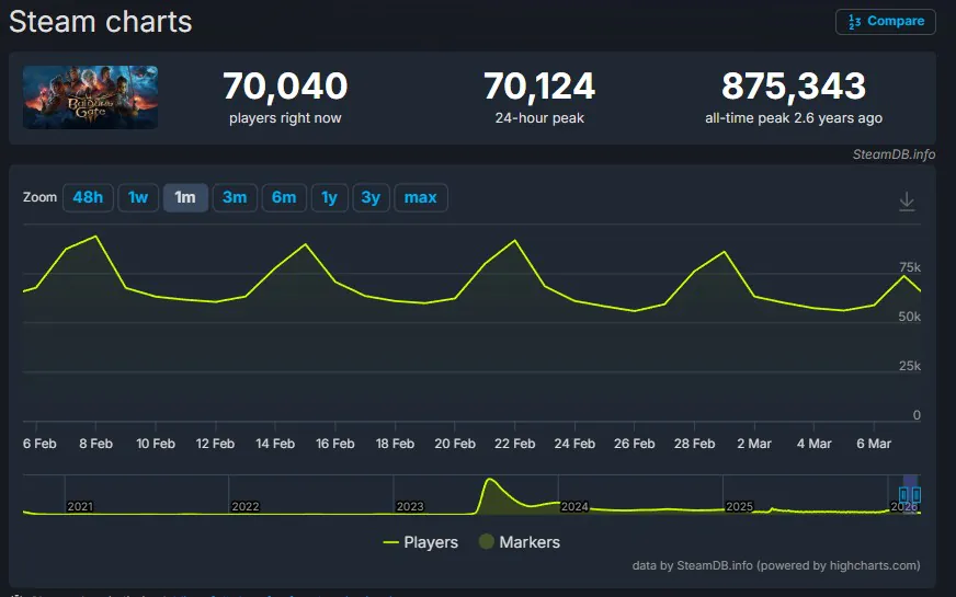 虽然早已摸不到87.5万那离谱的峰值,但发售近三年后的今天,博德之门3在Steam上依然保持着日均7万的惊人在线,这背后是一群死忠玩家在撑着。