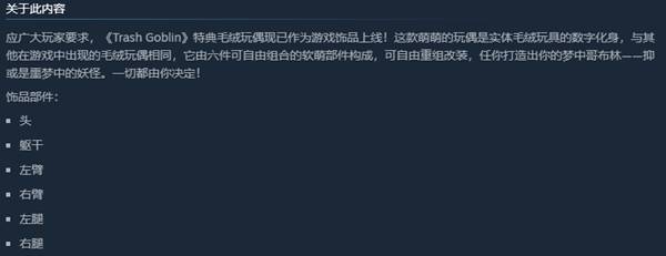 玩家购买后毛绒哥布林物品就会加入游戏中,分别需要部件头、躯干、左臂、右臂、左腿、右腿组装而成。