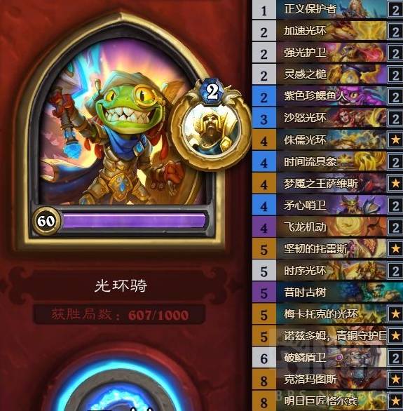 灵感之锤卡耐久配合,不要贪沙怒光环回合,基本触发一次收益就行,提前挂,赢点其实是守赢,一地圣盾嘲讽还带回合结束buff叹息之墙,这版本是我打炉石以来对手主动麻溜投降最多的一个版本,