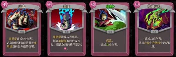 【取回】本身一回合一次的0费抽一,相当于白嫖伤害,同时可以帮助触发【重压】【紧追不放】【猛晃】【榨取】之类的牌的附加效果,属于前期可以无脑带一张,中后期没配合上也不亏,配合上就血赚的牌。【重压+】则是朴实无华的0费打16,除了初始牌组中的【出击】以外还有一张奥斯提攻击牌,就可以拿了,拿完可以再适当补点别的奥斯提攻击牌。