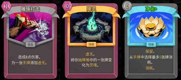 除了核心的回能和过牌卡以外,【雕琢打击】和【降灵】也是很值得拿的,它们就类似战士的【坚毅】【燃烧契约】之类的"消耗"牌,能够让我们在单场战斗内精简牌组,帮我们更好地达成无限。
