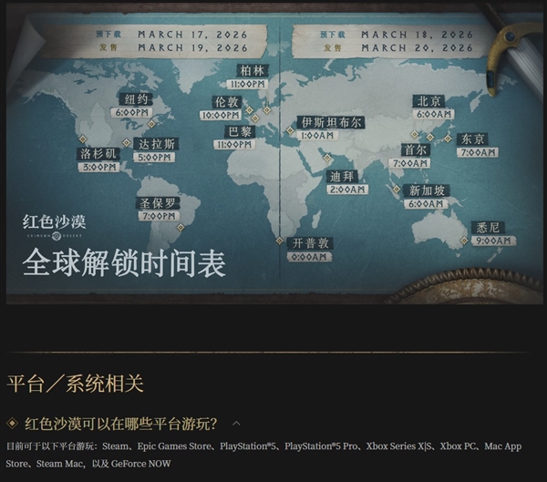 官网附有详尽的全球各地预载/解锁时间表并列明游戏为玩家准备了包括Steam Mac、Mac AppStore在内多个版本,并支持GeForce NOW云游戏: